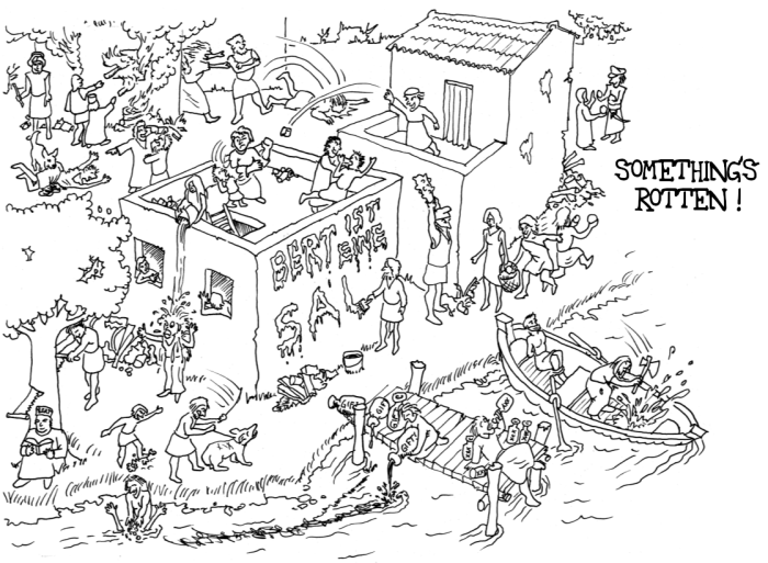 Earth was a dead, peaceful planet—until two cosmic vandals named Gerr and Hott came by. (The name is an anagram: Gerr and Hott = Herr und Gott [Lord and God]. All of creation theology, scrambled into two irresponsible good-for-nothings.) Drunk and bored, they dumped their biological waste into the primordial seas: fermented ribose, rancid albumin paste, spoiled gelatin sludge, stirred with a bent coal shovel. Then they flew away and forgot about it.